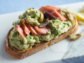 A tasty sample of the Mediterranean diet on an easy-to-make avocado toast. California Avocado hummus, salmon…