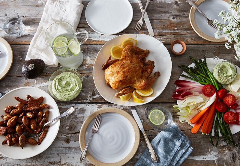 I’d always thought that green goddess salad dressing was so named for its reliance upon an abundance of tender, bright green herbs but, in fact, it was created at the San Francisco Palace Hotel in 1923, after a popular play of that era, The Green Goddess. Similar to other creamy dressings, it is made with half mayonnaise and half sour cream or yogurt and a large amount of herbs, chief among them being tarragon, a woefully underused herb. The anise-like tarragon and chives or scallions lend a mild bite. I add a ripe avocado to my version! This verdant, refreshing dressing is perfect on crunchy romaine lettuce, but it can also be served as a dip for crudité or boiled, roasted, or fried potatoes and roasted chicken.