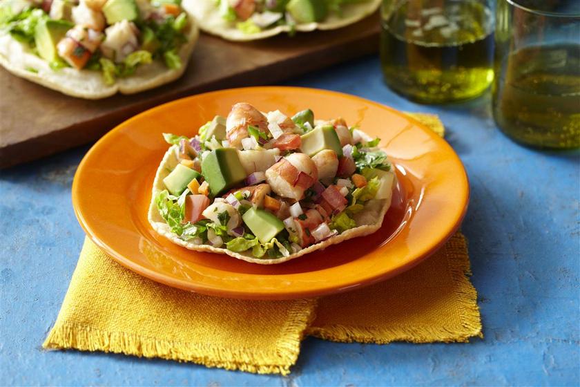 Pump up your basic tostada with fresh California Avocados and jumbo shrimp.