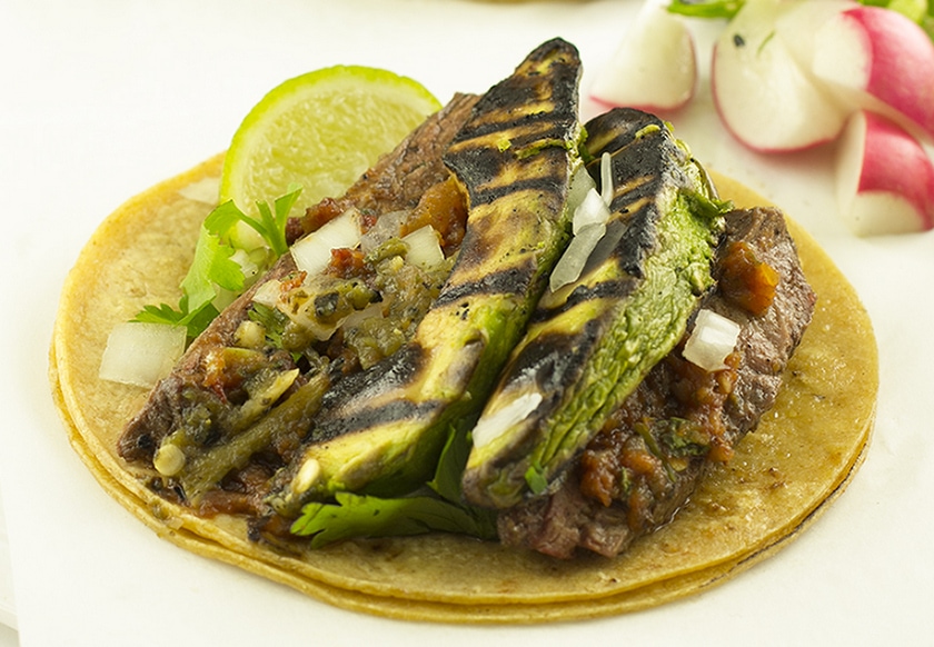 These little carne asada tacos are just like the ones you might get from your favorite taqueria in San Diego or Santa Barbara, or the best taco trucks in East L.A. or The Mission District of San Francisco. Cumin-kissed grilled steak is topped with gorgeous grilled avocado, cilantro, onion, and salsa. Serve these tacos at your next barbecue or for a quick and easy street taco night at home. These tacos pack a nutrient punch with excellent sources (20% DV or more) of 55% DV Vitamin B12, 45% DV Vitamin B6, 35% DV Vitamin K, 25% DV Magnesium and 20% DV Vitamin C.