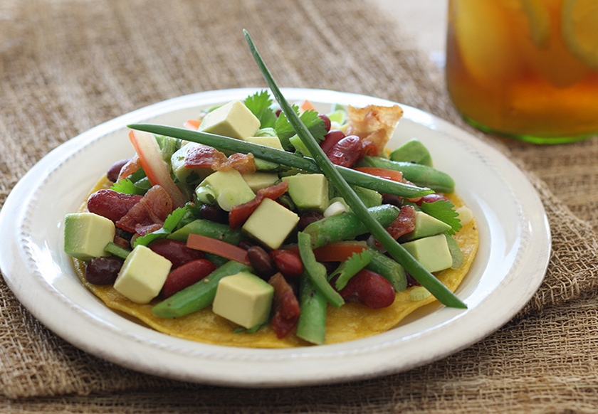 Amp up your tostada by topping it with fresh California Avocados, green beans and bacon.