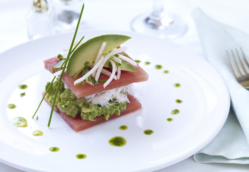 - On each plate, place one slice of watermelon. Place about 2 ½ tablespoons of the avocado mixture on top of each watermelon slice, followed by 1 oz. of crab. Top with another slice of watermelon. Garnish top with Deviled Jicama, a little of the Chervil Vinaigrette and a slice of Fresh California Avocado. Sprinkle with chopped chives and a little sea salt. Serve.