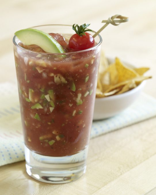 - Add the salt, pepper, tomato juice and tequila. Top with ice and shake vigorously. Strain into a tall glass filled with ice. Garnish with additional cherry tomatoes and an avocado slice.