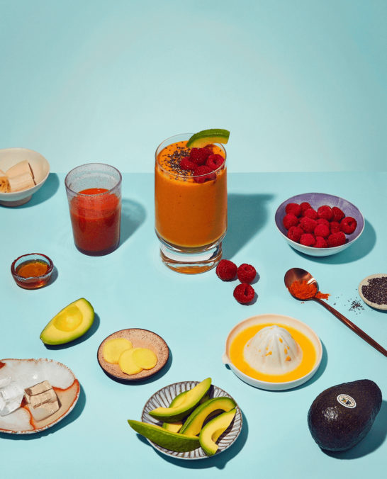 Turmeric, ginger and California Avocado along with carrot juice, banana, honey and naval orange to sweeten things up will have you enjoying this smoothie. You can have this for breakfast or a healthy snack getting your protein needs (12% DV), fiber (39% DV), B vitamins B1 (35% DV), B2 (25% DV), B3 (25% DV), B5 (40% DV), and B6 (60% DV), and 60% DV vitamin C and a whopping 25% DV vitamin A.