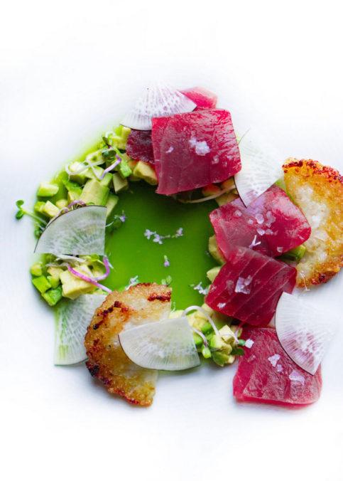 - Place the diced California Avocado, sliced Ahi tuna and radish in a circle, creating a crown on your plate.