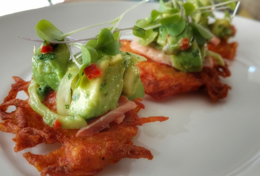 24 potato latkes (recipe to follow) 24 oz. honey smoked salmon, chunked 24 oz. California Avocado Salad (recipe to follow) 175 strands of cilantro micro green 4 oz. avocado oil Mini Potato Latkes (Yield: 24 small latkes) 4 Eggs, beaten 1/3 cup corn starch 2 Tbsp. chives, finely chopped 1/2 tsp. black pepper Salt (approximately 1 tsp.), to taste 6 medium Colorado potatoes peeled, small shreds/box grater 4 oz. white onion, grated As needed Canola spray California Avocado Salad(Yield: 24 1-ounce servings) 4 oz. Key lime juice (about 12 Key limes) 3 Tbsp. natural cane turbinado sugar 1 tsp. salt 4 oz. Sweet Colorado Onion, fine julienned 2 Tbsp. sweet piquant chile peppers, finely minced 1 Tbsp. jalapeño peppers, seeded and finely minced 16 oz. Fresh California Avocados*, peeled, seeded, diced (about 4 California Avocados) 1 bunch cilantro, choppedInstructions