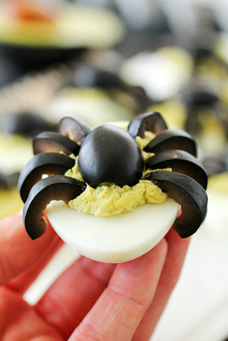 I think the last one is the best one, don’t you think? I love Halloween treats! Treats with candy corn, food shaped like mummies and fake spiders decorating something yummy. These avocado deviled eggs with spiders are a spooky treat that’s sure to please!