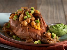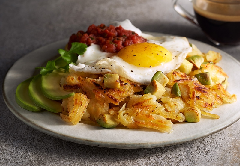 Hash browns done California style with delicious, nutritious California Avocados and topped with sour cream, salsa and cilantro make this dish for vegetarian and gluten-free diets. In addition to great taste, the addition of the avocados adds to the healthfulness of this breakfast dish providing an excellent source (20% DV) of potassium, vitamin E and B5, along with a good source of dietary fiber (14% DV), protein (12% DV), 15% DV of folate and vitamin B 3 along with 10% DV of iron, vitamins K and B6. If you choose to pass on the sour cream, it great for a vegan diet. Enjoy!