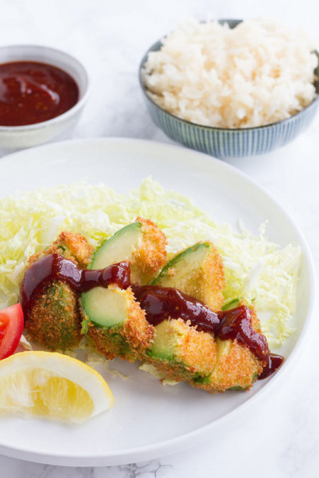 Katsu, a battered then deep fried cutlet of meat, is a very popular dish in Japan, the most popular probably being tonkatsu, which is made using pork fillet or pork loin. Katsu is usually served with tonkatsu sauce, a sweet and savory sauce, shredded cabbage, sometimes a lemon wedge, rice, and an assortment of side dishes. It is absolutely delicious. I have seen multiple vegetarian versions, including tofu katsu and Portabello mushroom katsu, but today I’m sharing a version made with California grown avocados. Avocado katsu is rich and creamy and totally worth making whether or not you eat meat or not!