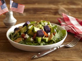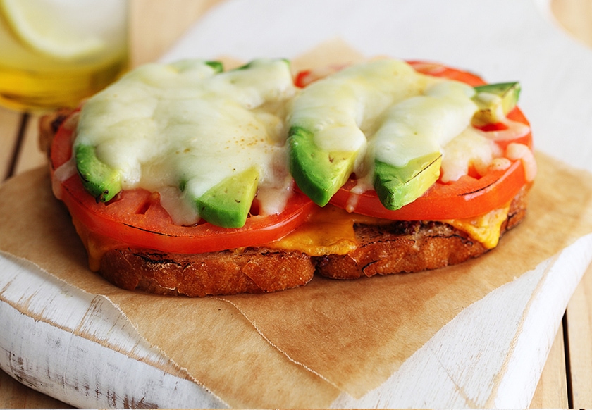 Toasted sourdough bread topped with cheddar cheese, jack cheese, sliced tomato and Fresh California Avocado, baked and served open faced.