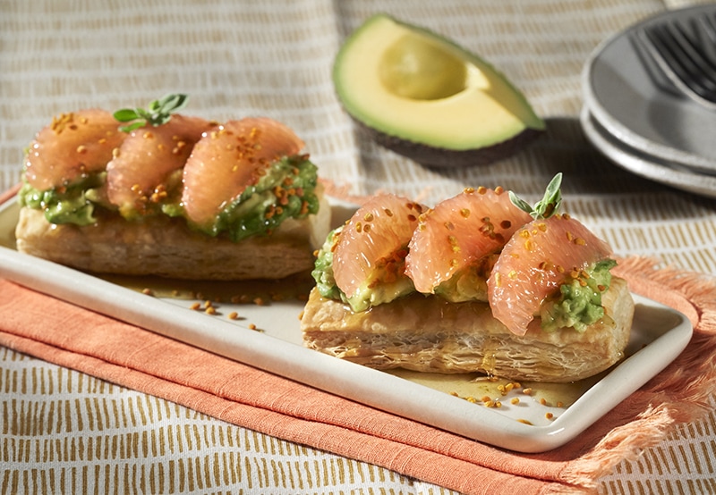 This unique and versatile tart can be served before or after dinner, thanks to its unique balance of flavors and textures. Each bite starts with flaky pastry, followed by a creamy dollop of California Avocados and bright acidic grapefruit, ending with a sweet and spicy kick of yuzu kosho-honey sauce.