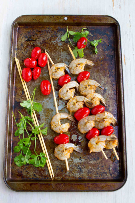 - Thread the shrimp and tomatoes, using about 6 shrimps and 3 tomatoes per skewer.
