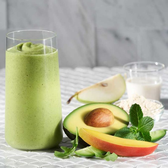 Treat yourself to this spa smoothie before or after you exercise, or any time you want a quick refresher. This California Avocado smoothie is delicious, providing 30 grams of protein, 18 grams of fiber, antioxidant vitamins A (15% DV), C (120% DV) and E (70% DV), and a medley of vitamins and minerals including a high potency of vitamins B5 (100% DV), vitamin B2 (100% DV), vitamin B12 (210% DV).