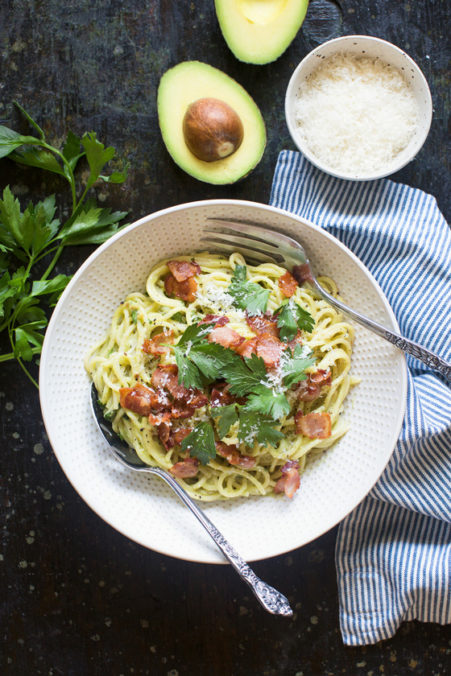 Instead of raw eggs, this Avocado Carbonara is sauced with a blended mix of a ripe California Avocado, lemon juice, Parmesan cheese, salt and pepper. Hot, starchy pasta cooking water is added to thin everything out. With the use of a blender, this sauce comes together in a matter of moments.