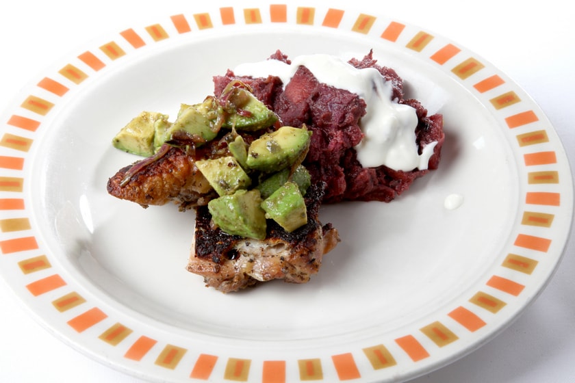 Zesty, juicy grilled chicken is sensational when topped with marinated California Avocados and served with a purple sweet potato hash.