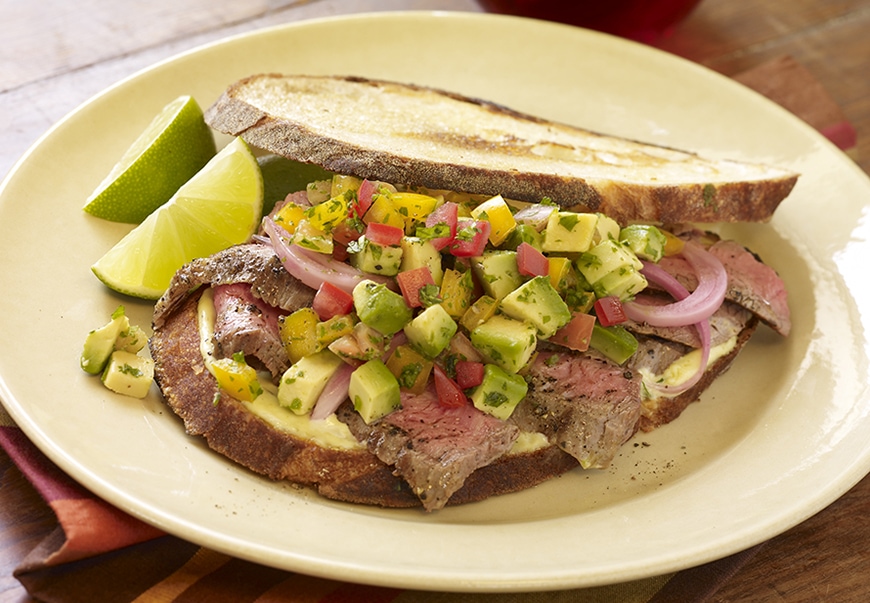 1 - 2 lb. Wagyu flank steak 1 - 1 lb. loaf sourdough bread, sliced As needed Avocado-Heirloom Tomato Salsa (recipe follows) As needed Pickled Onions (recipe follows) As needed Jalapeño Mayonnaise (recipe follows) As needed California Avocado-Heirloom Tomato Salsa (Yield: 4-1/2 cups) 3 each large Fresh California Avocados*, small dice (20 oz.) 3 heirloom tomatoes, small dice (24 oz.) 1/2 oz. cilantro, minced 1 Tbsp. olive oil 1 oz. lime juice As needed salt & pepper to taste Pickled Onions (Yield: 4 cups) 2 large red onions, julienned (17 oz.) 8 oz. water 6 oz. red wine vinegar 10 peppercorns 3 Tbsp. sugar 2 tsp. salt Jalapeño Mayonnaise (Yield: 1-1/2 cups) 2 jalapeños (2 oz.) 1 1/2 oz. egg yolks (3 yolks) 8 oz. canola oil 1 garlic clove 1 oz. lime juice As needed salt & pepper to tasteInstructions