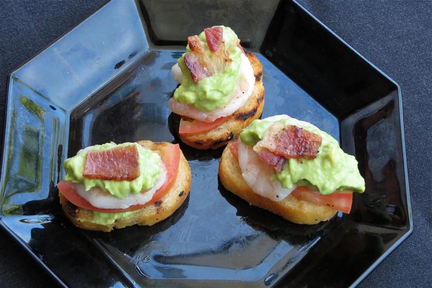 De-seed Serrano pepper and finely dice. Peel and de-seed avocados and place in a blender or food processor with Serrano pepper, hevy cream, and lemon juice and blend until smooth and well incorporated. Slice baguette in ¼” slices and brush with olive oil, season with salt and pepper, then grill until lightly toasted. Spread baguette slices with a light layer of avocado mousse, top with roma tomato slice, poached shrimp, a dollop of avocado mousse, and bacon slice.
