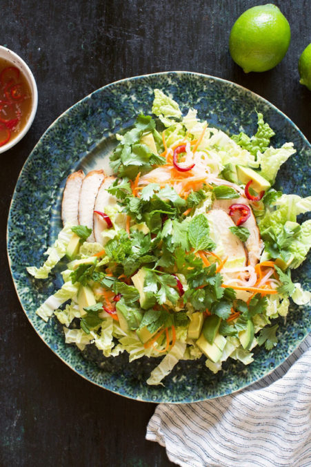- To serve, divide cabbage, avocado and sliced chicken between 4 plates. Scatter pickles around each plate. Drizzle dressing evenly around the salads (including some of the chiles), and serve any extra at the table. Finish with a sprinkling of cilantro leaves and torn mint.
