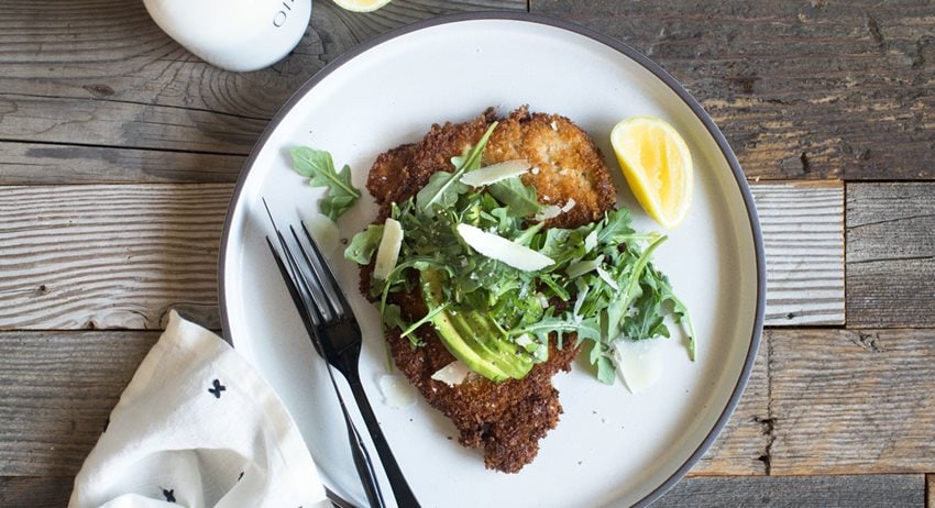 To start, boneless pork chops—seasoned with salt, pepper and cayenne—get the standard breading treatment: flour, egg and breadcrumbs. I’m using panko breadcrumbs here, because I just love that crunch. Next, the chops are quickly fried until golden and crispy. The pork is finished with a salad of ripe California Avocado and arugula dressed in lemon and olive oil, and shavings on salty Parmesan cheese on top! This dish is easy enough to enjoy on a hurried weeknight, but impressive enough to serve at an intimate gathering with friends or family.