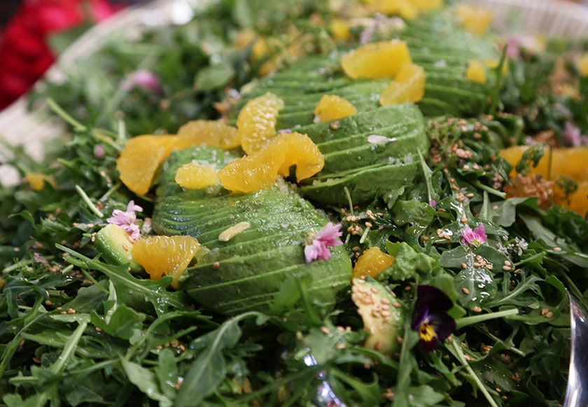 A beautiful salad featuring fresh, local citrus, zesty arugula and California Avocado garnished with edible flowers.