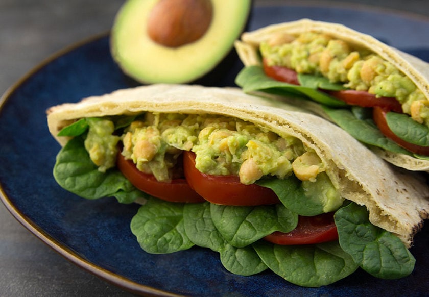A quick and easy vegan pita sandwich with a delicious chickpea and avocado salad inside. You could also make the chunky avocado hummus recipe and serve as a dip or on the spinach and tomato as a salad.