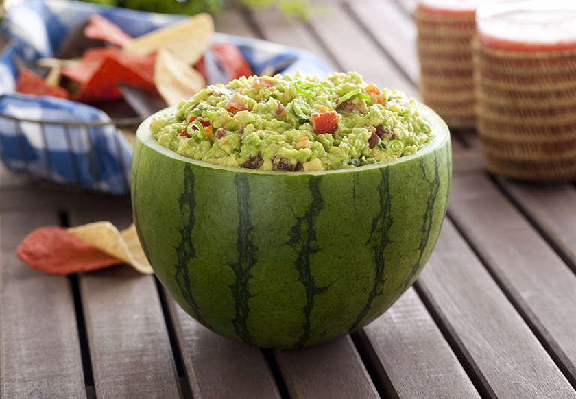 This American Summer Holidays guacamole is perfect for your 4th of July celebration. Uniquely served in a mini watermelon bowl that you can bring to a picnic or party with no dishes to clean up, this spicy Firecracker Guacamole is delicious, low in sodium and a good source of Vitamin C.