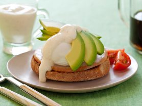 Eggs Benedict California style with fresh California Avocados and tomato, made easy with prepared Hollandaise sauce.…