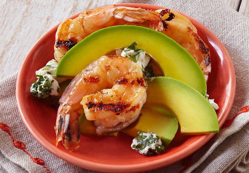 Grilled seafood has never been so good. Shrimp marinated with a spicy chili flair covered with a sweet honey glaze. Prepared with Fresh California Avocados, cilantro, and cilantro goat cheese.