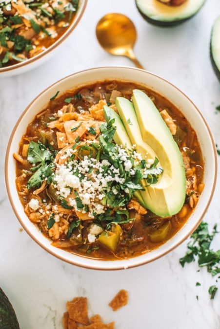 This hearty Mexican chicken soup comes together in just half an hour and is full of rich spices and the flavor of classic enchiladas verdes, plus crispy tortilla chips and creamy and cool California Avocados.