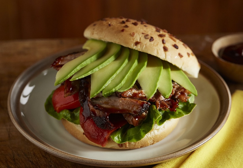 Savory pork shoulder, bell peppers and thinly sliced California Avocados on top of an onion Kaiser roll.