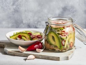 Pickled avocados, onions, garlic and chiles make a great addition to your charcuterie board or the…