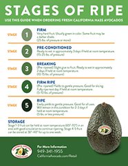 This one-page guide explains the five stages of avocado ripeness. It’s useful for ordering the appropriate stage of ripeness.