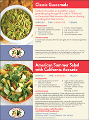 A 20-page booklet with 19 vegetarian recipes and tips featuring California Avocados and a wide variety of fresh fruits and vegetables. Many recipes are vegan. With ideas from breakfast and sandwiches to a smoothie and dessert, these California Avocado recipes appeal to shoppers hungry for ideas to use more plant-based foods.