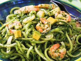 - Place the marinated shrimp on the grill and turn periodically. Once cooked through, cut each shrimp into thirds on the bias and transfer to a mixing bowl. Add the avocado and arugula leaves and toss with the Heirloom Tomato Vinaigrette. Season to taste with salt and pepper.