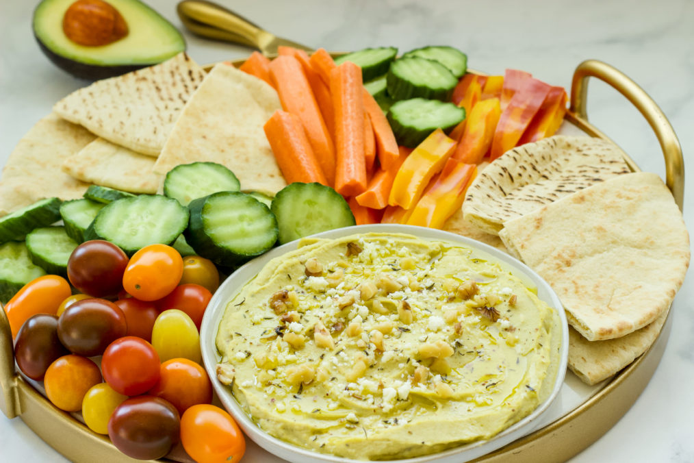 A flavorful Mediterranean-inspired appetizer platter featuring an avocado hummus recipe with great nutrition and heart-healthy goodness from the California Avocado.