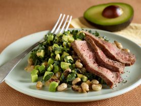 New York Strip Steak with Crisp Black Eyed Peas, Kale, California Avocado and Preserved Lemon Vinaigrette