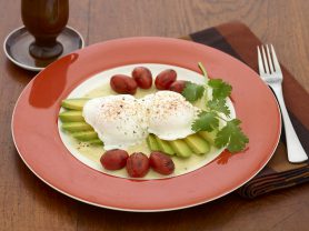 This is a lovely spring dish to serve on and around Mother’s Day. Executive Chef Dane Blom created this gorgeous small plate for California Avocado Month (June). It’s also a beautiful presentation for a light lunch or brunch.