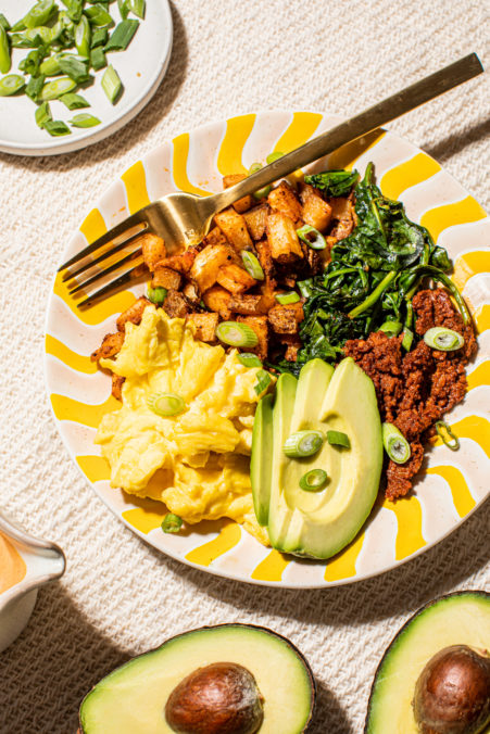 All the flavors you love about a breakfast burrito, served in a nourishing bowl. Made with crispy roasted potatoes, fresh spinach, smoky ground chorizo and topped off with a creamy chipotle honey drizzle sauce for the perfect blend of sweet and spice.