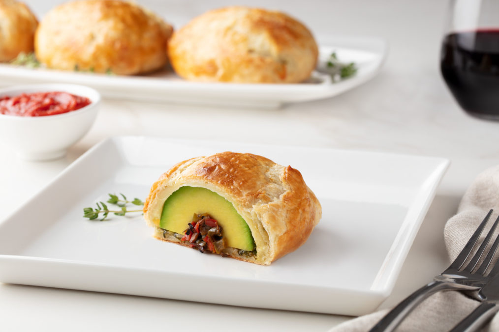 This 2021 California Avocado Recipe Contest runner up dazzles with a vegetarian take on the classic Beef Wellington recipe. An avocado half is stuffed with sauteed vegetables, topped with cheese, wrapped in puff pastry and baked. A fresh curry tomato sauce accents the California Avocado Wellington. It’s beautiful and delicious!