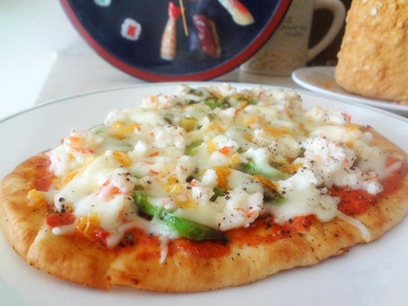 Avocado and crab pizza with tangy pizza sauce and mozzarella cheese on naan bread. Top with my original spicy sauce, Fireworks sauce.