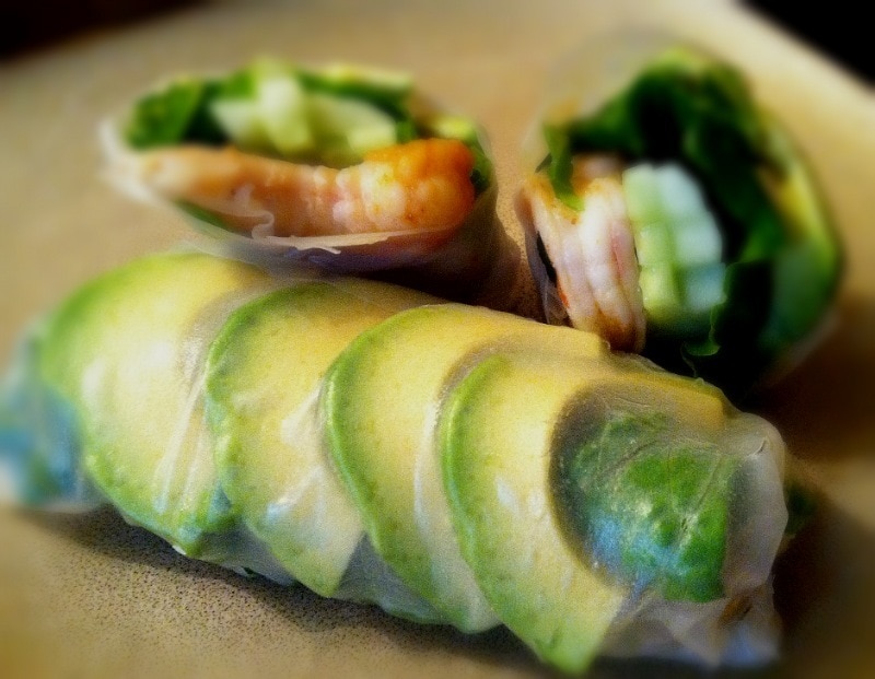 Spicy grilled shrimp, cool and creamy avocado, crisp cucumber and lettuce- bursting with fresh lime and cilantro, wrapped together in a light wrapper.