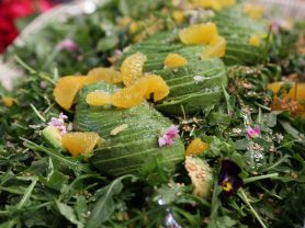 A beautiful salad featuring fresh, local citrus, zesty arugula and California Avocado garnished with edible flowers.