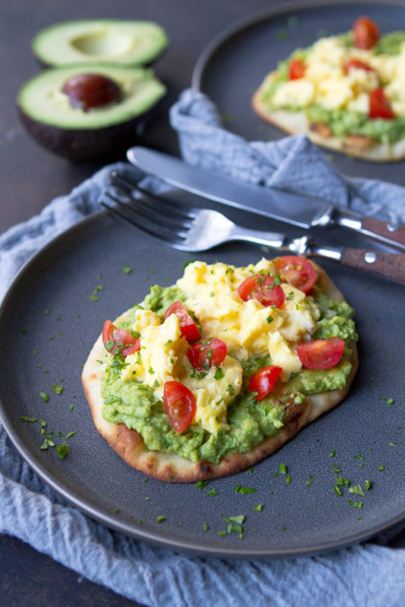 - Spread the guacamole on the toasted naan breads then top with the scrambled eggs and tomatoes.