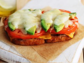 Toasted sourdough bread topped with cheddar cheese, jack cheese, sliced tomato and Fresh California Avocado, baked…