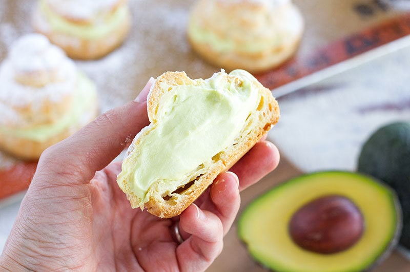 In honor of French Bastille Day on July 14th, I whipped up a batch of cream puffs, but gave them a bit of a California twist by filling them with a luxurious California avocado mascarpone cream. You may think that adding avocados to a sweet cream sounds strange, but I promise that after one bite you’ll be wanting to eat the cream out of the bowl with a spoon. The buttery flavor and texture of the avocado makes the cream even better and gives a beautiful light green hue. Summer will be better with a batch of these in your life. Seriously.