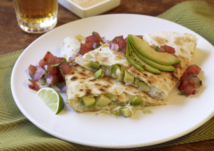 6 oz. shredded Monterey Jack Cheese 3 oz. crab meat 1/2 Fresh California Avocado*, peeled and diced 1 oz. scallions, roughly chopped As needed Pinch of black pepper 1 tsp. olive oil 2 9" flour tortillas As needed Pico de Gallo (recipe follows) As needed Chipotle Aioli (recipe follows) As needed Sour cream for serving Pico de Gallo (Yield: 2 cups) 1 large heirloom tomato, diced 1 small red onion, diced 1 jalapeno, finely diced 2 Tbsp. cilantro, chopped 2 limes, juiced Chipotle Aioli (Yield: 1 1/4 cup) 8 oz. mayonnaise 2 Tbsp. water 1 Tbsp. chipotle chile powder 1/2 Tbsp. lime juice 1 garlic clove, minced 1 tsp. cilantro, chopped As needed Salt and pepper to tasteInstructions