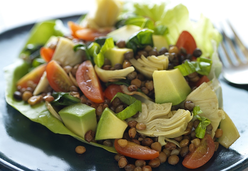 Fast, fresh, and full of fiber, this meatless main salad explodes with fresh flavors of basil, rosemary and sweet tomatoes. The tenderness of the avocado combined with the deeply marinated artichokes makes every bite pop!