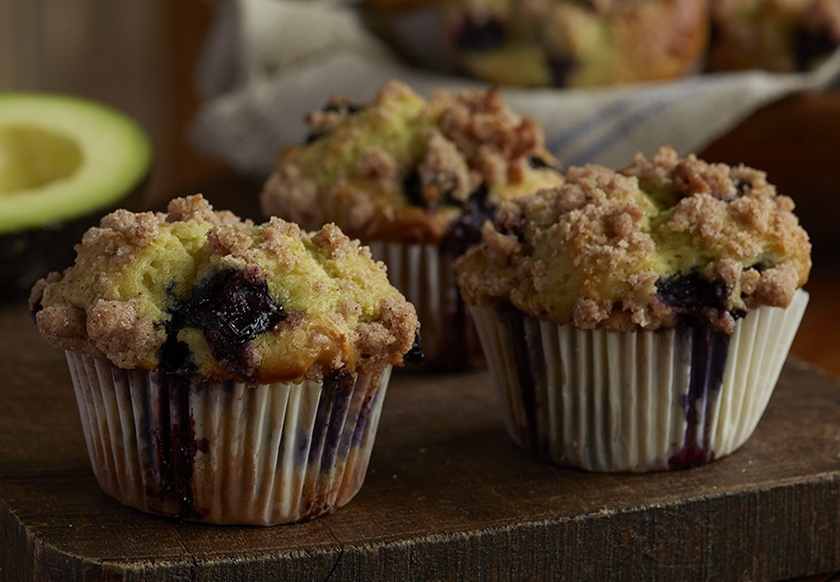 This recipe for blueberry muffins is perfect for breakfast or anytime. With California Avocado replacing half the butter normally used, these muffins have reduced calories, fat, sodium and cholesterol with increased “good fats”. There’s nearly 20 vitamins, minerals and phytonutrients in avocado, not to mention the nutrition in blueberries. And the taste? These streusel-topped muffins are moist and seriously delicious.