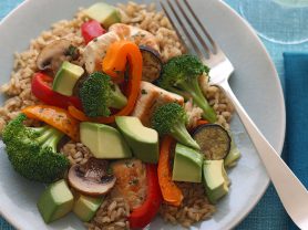 Penne pasta is tossed with balsamic-roasted vegetables then topped with creamy Fresh California Avocados. Excellent source of Vitamin C. Good source of Vitamin A and Iron.