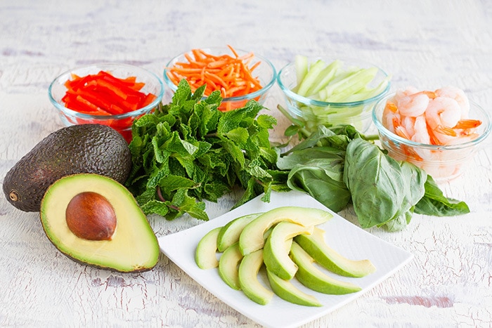 If you’ve got spring fever like I do and want to get out side, don’t worry, you won’t be spending precious daylight hours inside slaving away over a hot stove making this dish. Making the sauce takes a few minutes—you sauté some fresh garlic and ginger in a bit of oil, then add things like Thai sweet chili sauce, creamy peanut butter and toasted sesame oil. The finished sauce is creamy, slightly sweet and just a tad bit spicy. Making the noodles is as simple as boiling a pot of water. Literally. You bring a pot of water to a boil, turn the heat off and add the noodles, letting them sit and soften in the residual heat for several minutes. I like to chill them after they soften, but feel free to keep them warm! To finish off the salad, all you have to do is toss the noodles in some sauce, add some fresh veggies and shrimp, top them with lots of fresh sliced, creamy California Avocado, a bit more sauce, and some fresh herbs.